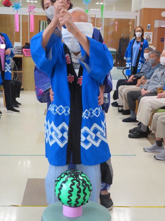 スイカ割りは、目隠しをしていただき周囲の声を聴きながら、