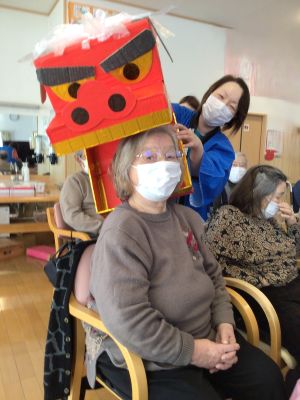 手作りの獅子で頭をパクっ!