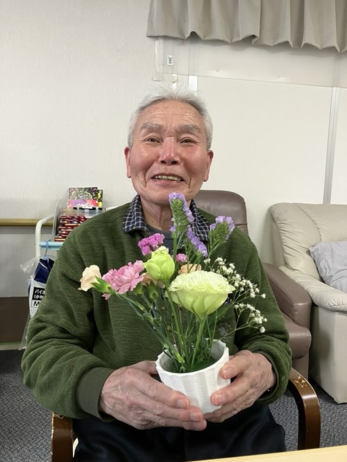 フラワーアレンジメントを行いました。皆さん花を見ると、とてもいい笑顔となり楽しそうに参加されてました。